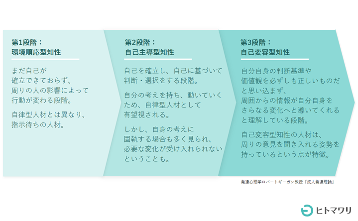 第1段階:環境順応型知性 まだ自己が確立できておらず、周りの人の影響によって行動が変わる段階です。自律型人材とは異なり、指示待ちの人材だと言えます。
