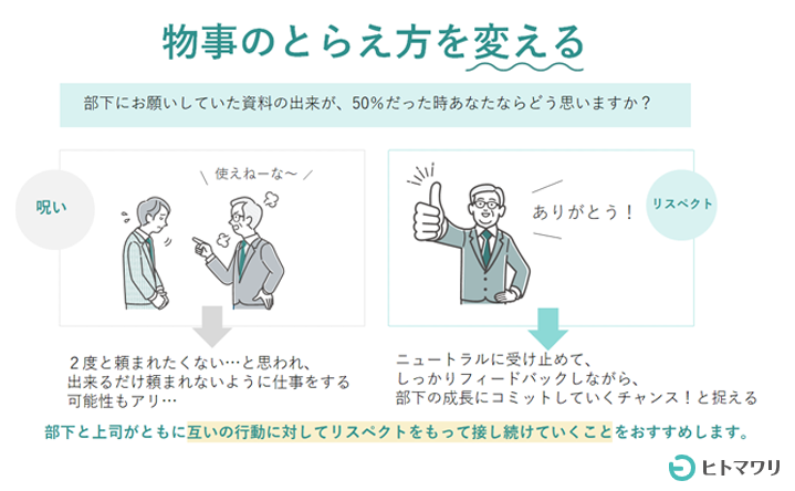 こういった考え方を、部下と上司がともに持ち、互いの行動に対してリスペクトをもって接し続けていくことを、おすすめします。